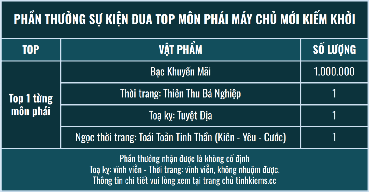Duy nhất 1 nhân vật đạt top ở mỗi môn phái được nhận thưởng, không bao gồm nhân vật đã nằm trong danh sách đạt giải Đua Top Cấp Độ.