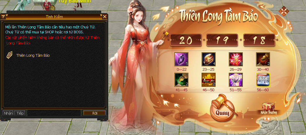 Người chơi tham gia sự kiện hãy đến đến NPC Thiên Long Tầm Bảo, xoay chuyển cơ duyên, thử thách vận số. Mỗi lần xuất thủ là một lần chạm tay vào may mắn, cơ hội nhận về những phần thưởng giá trị.