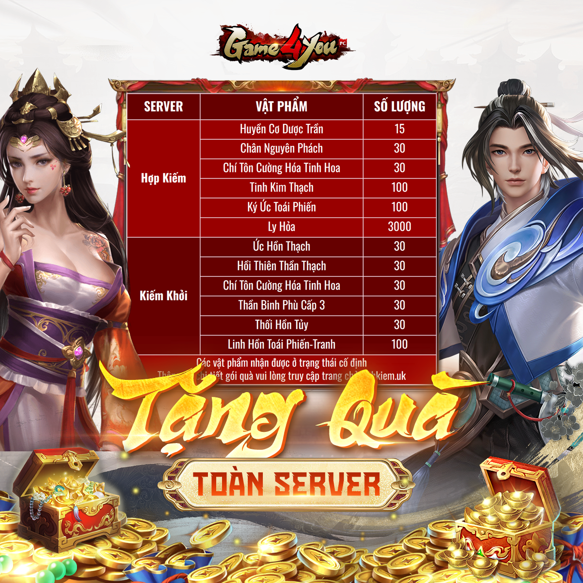 Giang hồ rộng lớn, bằng hữu bốn phương đã cùng đồng hành với Thiên Long Tình Kiếm suốt khoảng thời gian qua. Vì vậy BQT đã chuẩn bị gói quà cảm ơn dành cho toàn bộ bằng hữu toàn cụm server như một lời tri ân nhỏ.