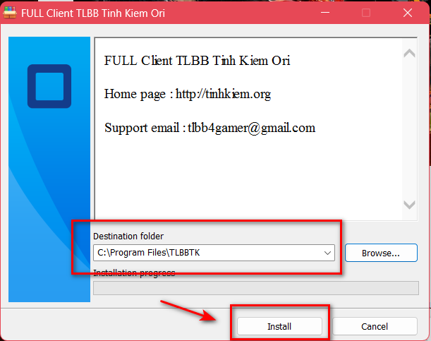 Cửa sổ cài đặt mới xuất hiện, cửa sổ này cho phép bằng hữu chọn đường dẫn đến nơi mình muốn chứa thư mục game TLTK, như hình, hệ thống sẽ mặc định lưu vào thư mục bạn đang lưu trữ file cài đặt game.