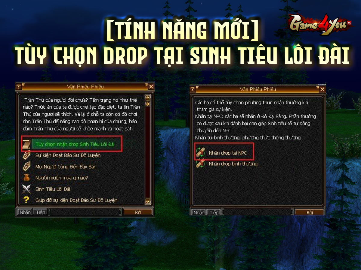 Nhằm giúp bằng hữu thuận tiện hơn khi tham gia hoạt động Sinh Tiêu Lôi Đài, bổn môn Thiên Long Tình Kiếm chính thức bổ sung tùy chọn mới trong việc nhận DROP (phần thưởng khi đánh bại con giáp Sinh Tiêu).