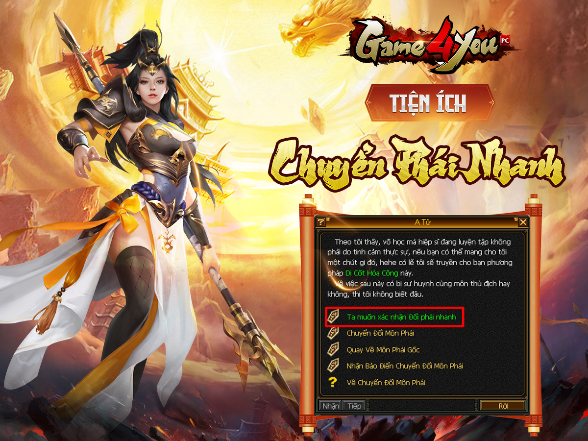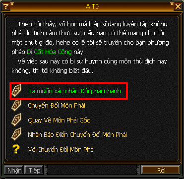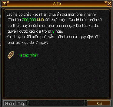 Tiện ích này dành cho các bằng hữu muốn thay đổi ý định, hoặc thích trải nghiệm các môn phái khác nhau mà không cần phải đợi 7 ngày.